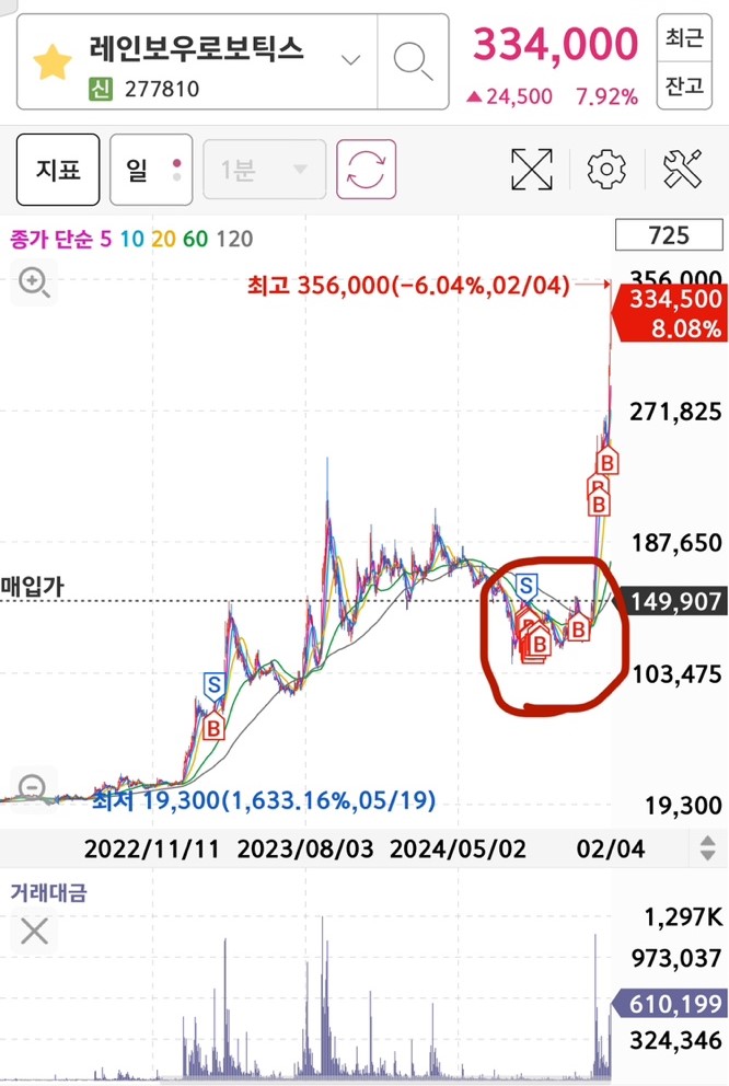 AI/로봇 업종에서 1등주를 조사했고 그중 1,000만원을 들고 있었을 당시 차트상 매집하기 가장 좋은 지점에 있었던 종목이 레인보우로보틱스였다.