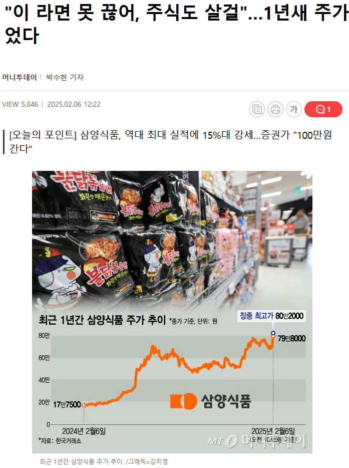 금일자 머니투데이 기사에서 "삼양식품"이 1년 사이 주가가 470% 상승했다고 나왔다.